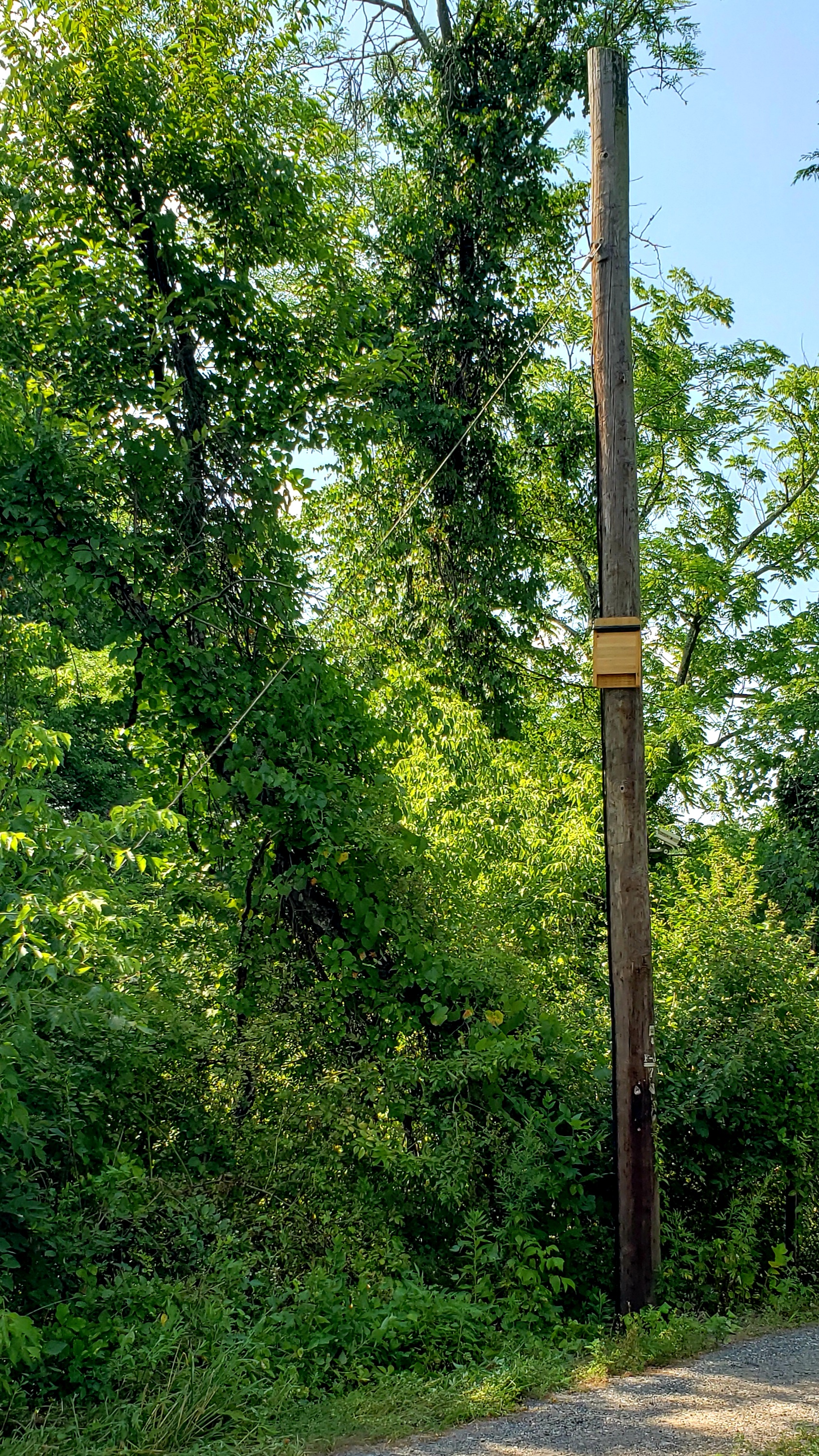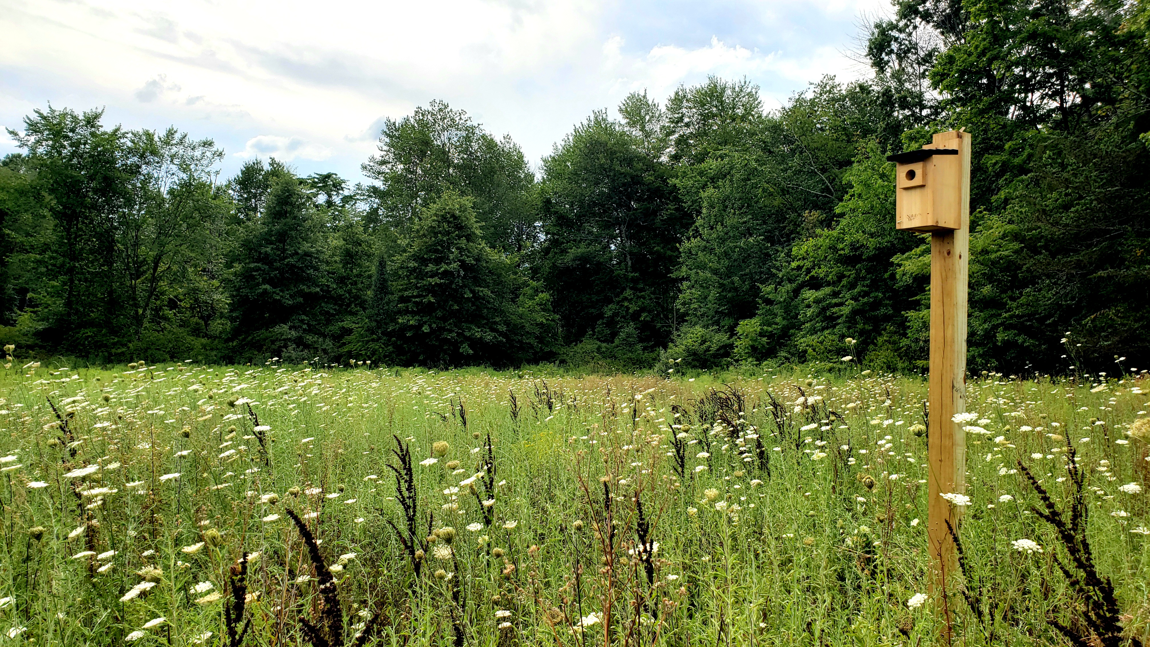 We chose this location because Bluebirds prefer large expanses of grass with a clear flight path. Our boxes are mounted 6 feet high. They are also 50 feet away from a tree line which avoids competition with house wrens. The heavily wooded area also serves as protection. Additionally, the openings are facing away from prevailing winds.