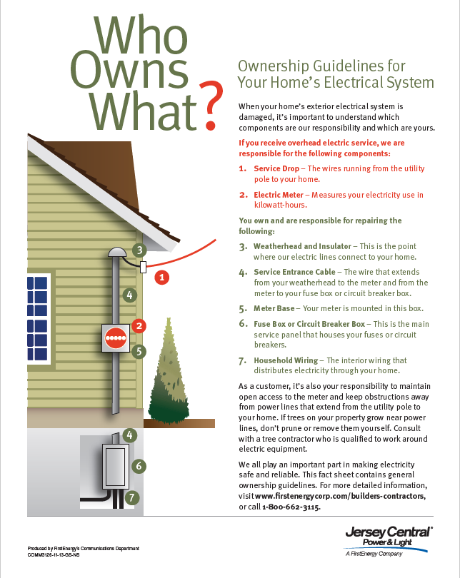 With storm restoration efforts continuing, Jersey Central Power & Light (JCP&L) reminds customers that they need to be aware of individual outages to their homes that may require an electrician and inspection before service can be restored. The attached photo provides information that helps explain what equipment customers may need an electrician to address before restoration can be completed